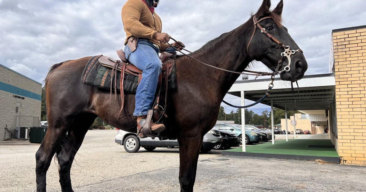 Don’t be surprised to see him holding the reins of his steed while standing in line at local restaurants, like the Cook Out on John C. Calhoun Drive. He welcomes people who come up to pet the animals and want to see what it feels like to step into the stirrups of a cowboy if only for a moment.